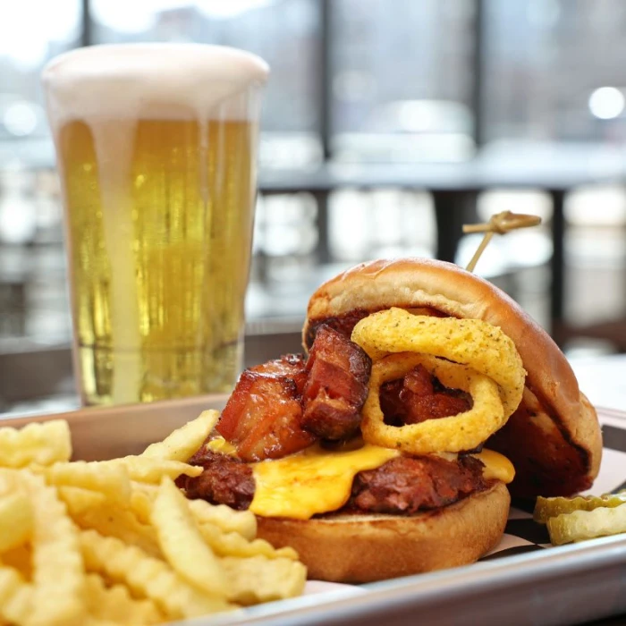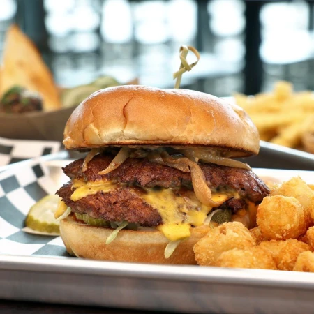 Single patty topped with house-smoked American, bacon burnt ends, smokey BBQ and Funyuns
